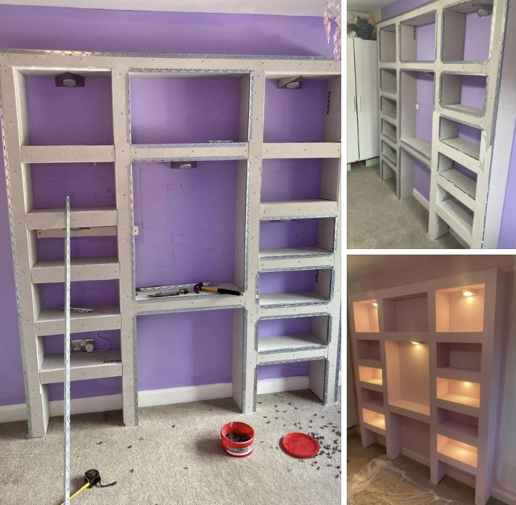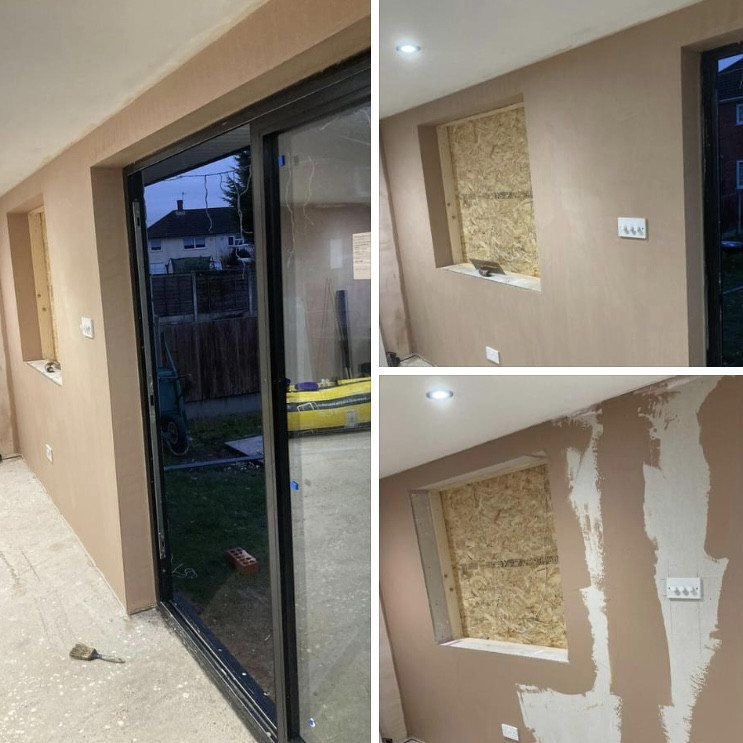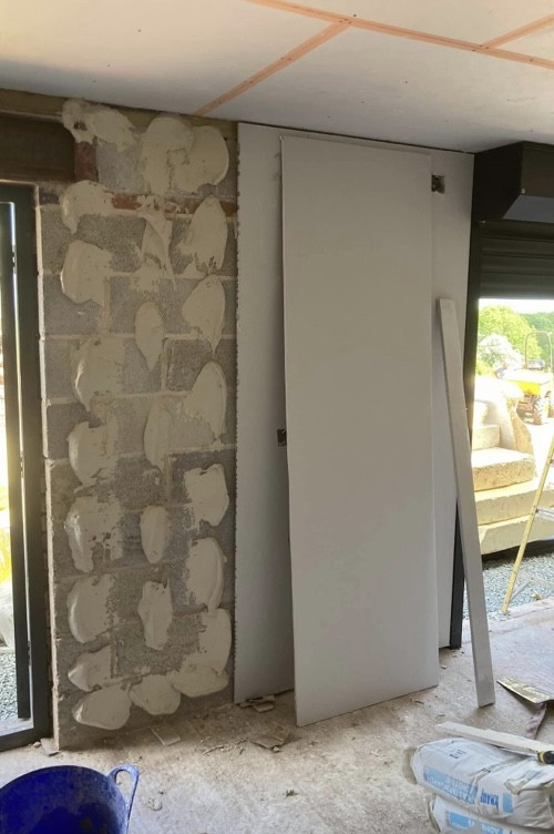 - Hack of entire wall, PVA, dot & dab new plasterboard and skim